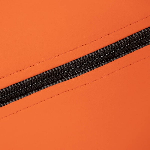 De jas is verkrijgbaar in het zwart, oranje en marineblauw.